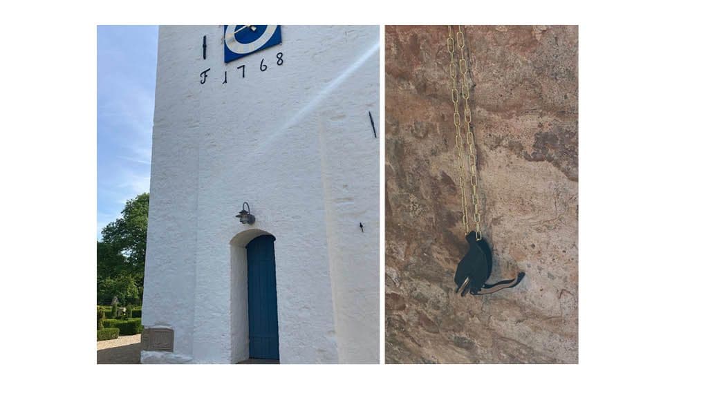 Find the stamp: The stamp is hanging in the bell tower at Kragelund Church. Go through the blue door, and it's hanging by the wall.